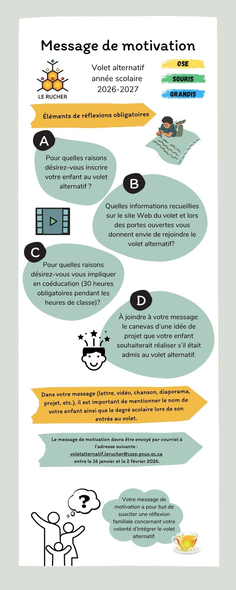 Afin d’être admissibles au volet alternatif de l’école Le Rucher, les parents doivent notamment produire un message de motivation qui a pour but de susciter une réflexion familiale concernant votre volonté d’intégrer le volet alternatif.