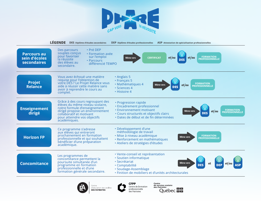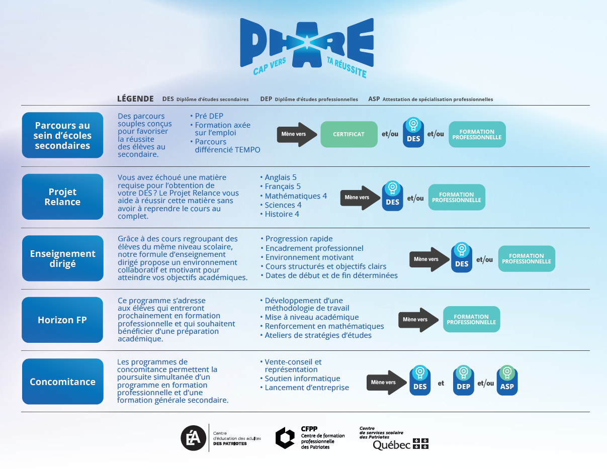 PHARE est le fruit d’une collaboration entre différents acteurs du Centre de services scolaire des Patriotes, unissant leurs expertises pour offrir aux élèves des parcours souples et adaptés à leurs ambitions. Conçu pour répondre aux besoins variés des apprenants, PHARE est là pour les guider vers une réussite scolaire et professionnelle.
